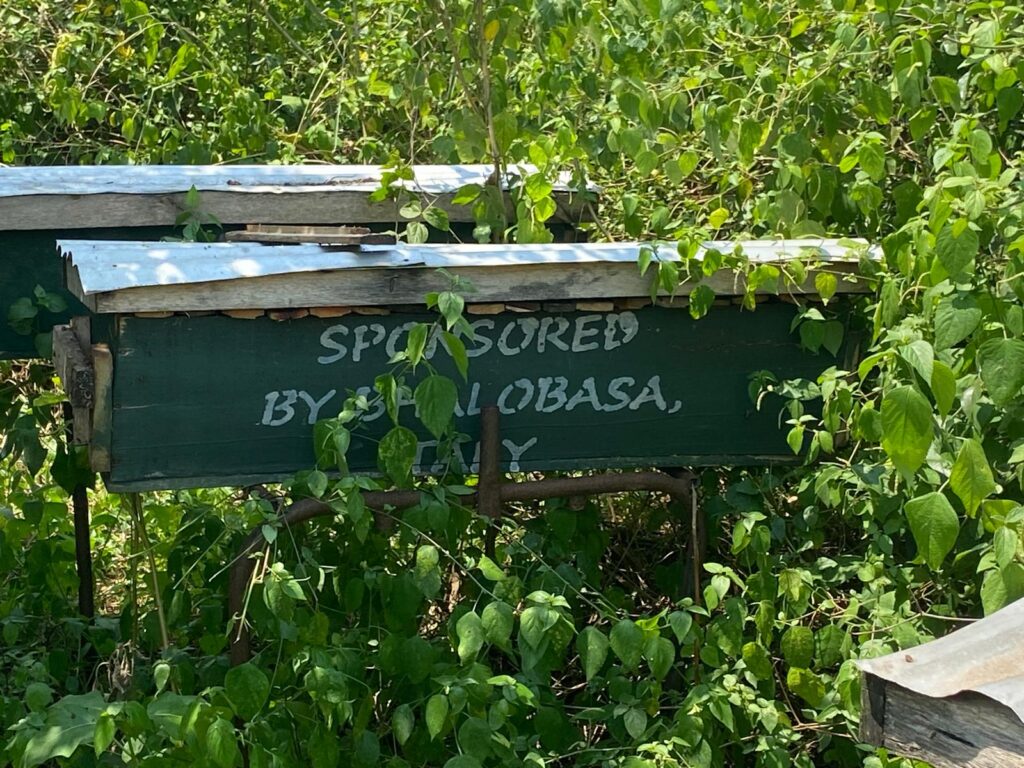 Proseguiamo fino al confine del Queen Elisabeth Park dove vivono circa 3000 elefanti. Gli sconfinamenti di questi animali nei campi coltivati sono un pericolo per l’uomo e un grave danno per la produzione agricola. Il recinto elettrificato, molto efficace, non sempre è presente per gli alti costi che comporta. Vengono così utilizzate le api che riescono a mantenere a distanza gli elefanti. Rwebeka e Bhalobasa hanno posizionato 100 arnie per contribuire a tenere lontani gli elefanti. Inoltre le api producono miele, fonte di guadagno.