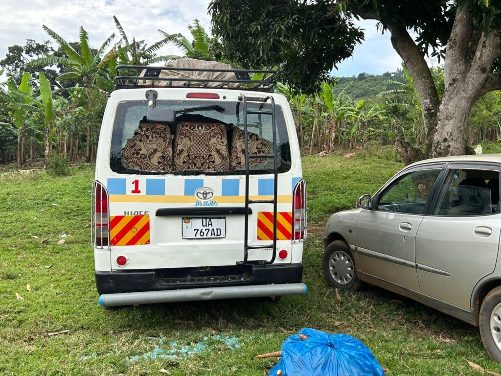 Ed ecco la brutta sorpresa! Alla fine del pranzo, quando stavamo per andare a visitare altri progetti nella zona, si è sentito un gran botto. Il lunotto posteriore del nostro pulmino, che era posteggiato sotto un albero lì vicino, è andato in mille pezzi. Per fortuna nessuno si è fatto male, ma noi siamo dovuti ripartire immediatamente per il paese di Miryana, dove avevamo prenotato l’albergo, per trovare chi potesse sostituire il vetro. Per fortuna il carrozziere è stato trovato, ma ormai sono le 17. Lui ci ha promesso che in serata arriverà da Kampala il lunotto di ricambio e durante la notte farà la riparazione.